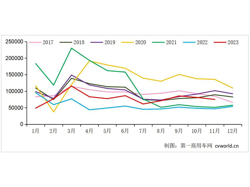 2017-2023年11月我國重卡市場銷量月度走勢圖(單位:輛)
