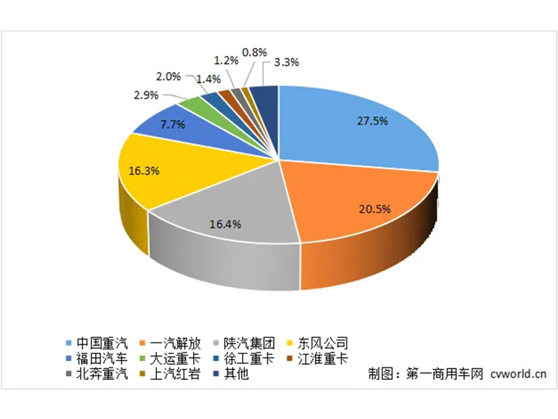 陜汽集團(包括陜汽重卡、陜汽商用車等)8月份銷售重卡約1.1萬輛,今年1-8月銷售各類重卡約10.26萬輛,同比增長2%,市場占有率為16.4%,躍升行業第三,同比上升了0.3個百分點。東風公司(包括東風商用車、東風柳汽乘龍汽車、東風華神等)8月份銷售各類重卡約1萬輛;今年1-8月,東風公司累計銷售重卡約10.16萬輛,同比增長4%,市場占有率約為16.3%,暫居行業第四,市場份額上升了0.6個百分點。