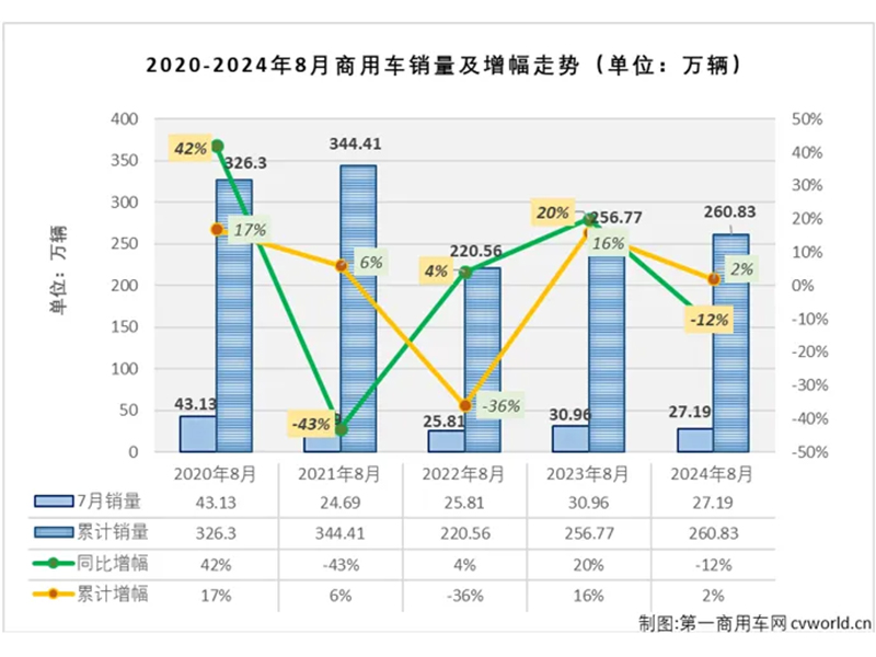 8月銷27.19萬輛,環(huán)比增長1%,同比下降12% **商用車網(wǎng)*新獲悉,根據(jù)中汽協(xié)數(shù)據(jù)(企業(yè)開票數(shù)口徑,非終端實銷口徑,下同),2024年8月份,我國商用車市場銷售27.19萬輛,環(huán)比今年7月份小幅增長1%,同比則繼續(xù)出現(xiàn)下滑,降幅為12%,同比降幅較上月(-7%)擴(kuò)大5個百分點(diǎn),遭遇“3連降”。