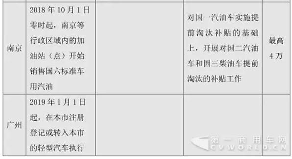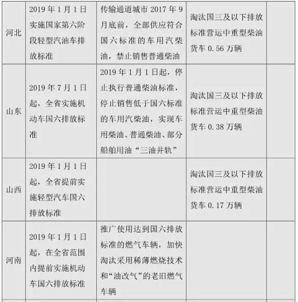 《打贏藍天保衛戰三年行動計劃》第十五條:大力淘汰老舊車輛,重點區域采取經濟補償、***使用、嚴格超標排放監管等方式,大力推進國三及以下排放標準營運柴油貨車提前淘汰更新,加快淘汰采用稀薄燃燒技術和“油改氣”的老舊燃氣車輛。各地制定營運柴油貨車和燃氣車輛提前淘汰更新目標及實施計劃。2020年底前,京津冀及周邊地區、汾渭平原淘汰國三及以下排放標準營運中型和重型柴油貨車100萬輛以上。2019年7月1日起,重點區域、珠三角地區、成渝地區提前實施國六排放標準。