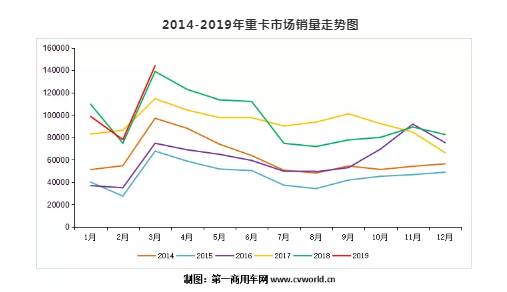 根據(jù)**商用車網(wǎng)*新掌握的數(shù)據(jù),2019年3月份,我國重卡市場共約銷售各類車型14.4萬輛,環(huán)比今年2月上漲85%,比上年同期的13.89萬輛上漲4%。